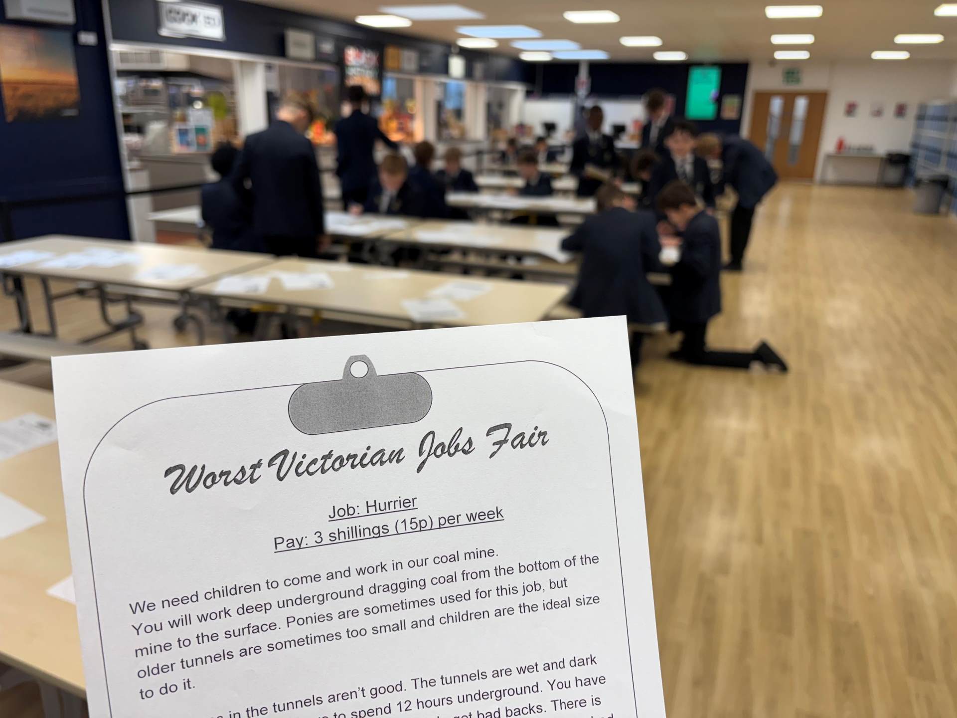 Year 8 students have taken a creative leap back to 1830 as part of their Industrial Revolution unit in Mr Pettitt’s history class. In a recent lesson, the school canteen turned into a bustling Victorian Job Fair, giving students an experience of life during one of the most transformative - and challenging - periods in British history. Students explored 50+ different job roles from the Industrial era from nightsoilsmen and match makers to coal miners and chimney sweeps. They were tasked with one unusual challenge: find the worst job possible – the one with the harshest conditions, lowest pay or highest risk. It was a lively (and often grim!) reminder of the tough realities faced by many during the 19th century. The lesson sparked important conversations about child labour, workers' rights and how far we’ve come.