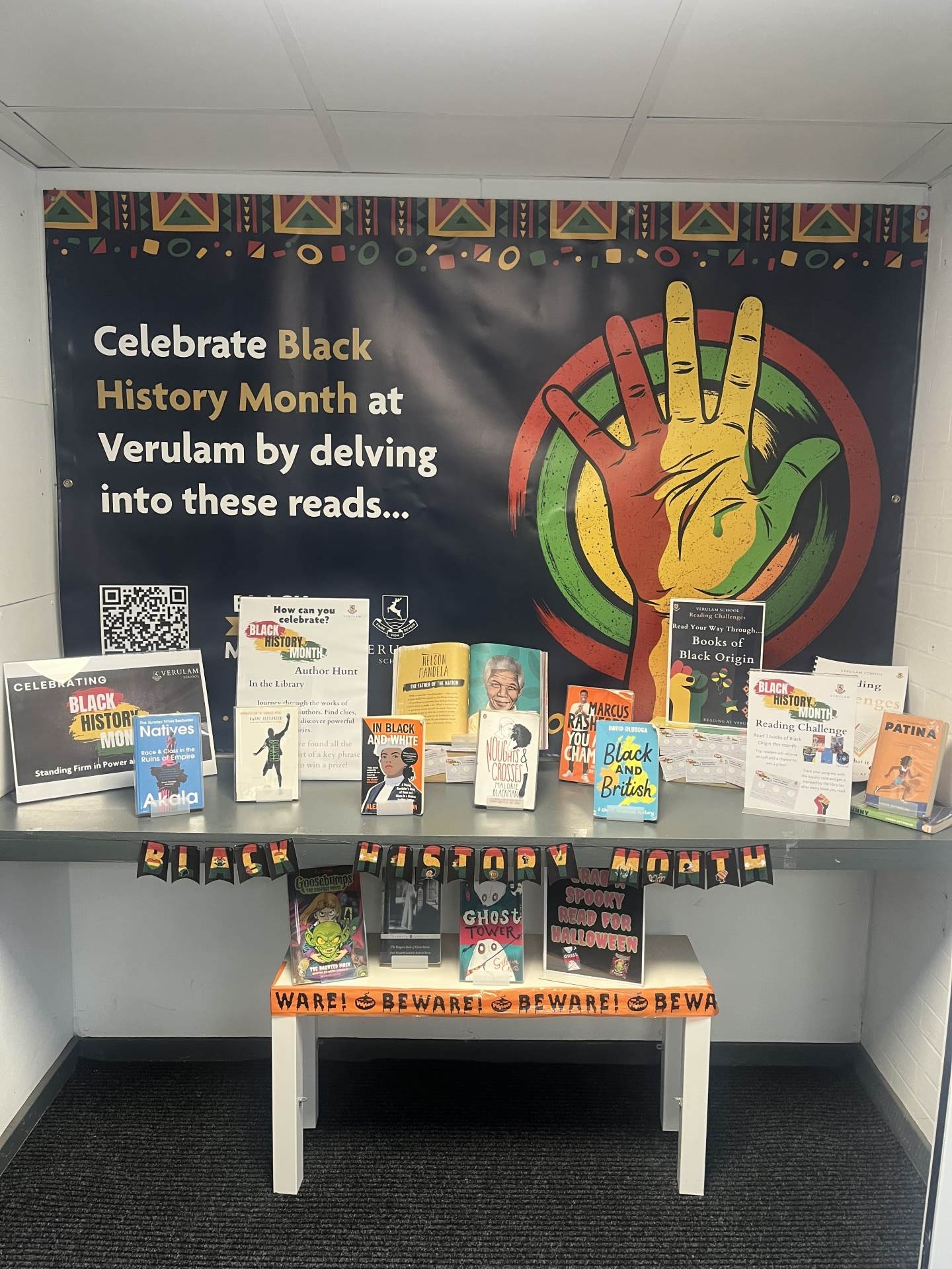 This October, the library celebrated Black History Month with a Reading Challenge and an Author Hunt. Students used their detective skills to follow clues around the library, searching for posters of authors of Black origin and deciphering hidden words within the texts.
