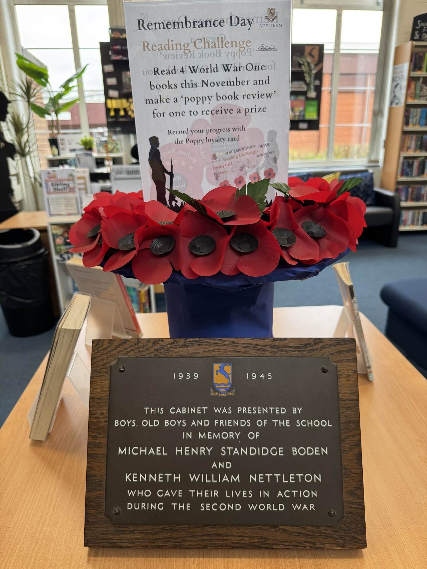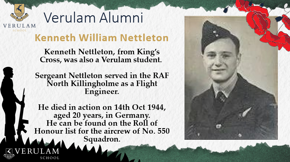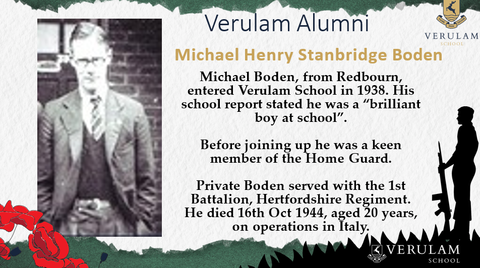 This year, we particularly remembered two Verulam Alumni, Michael Boden and Kenneth Nettleton. Both served during the Second World Way, Michael as Private in the 1st Battalion, Hertfordshire Regiment and Kenneth as a Sergeant in the RAF 550 Squadron. Both sadly lost their lives aged only 20, Michael on service in Italy on the 16 October 1944 and Kenneth on the 14th October 1944 in Germany.