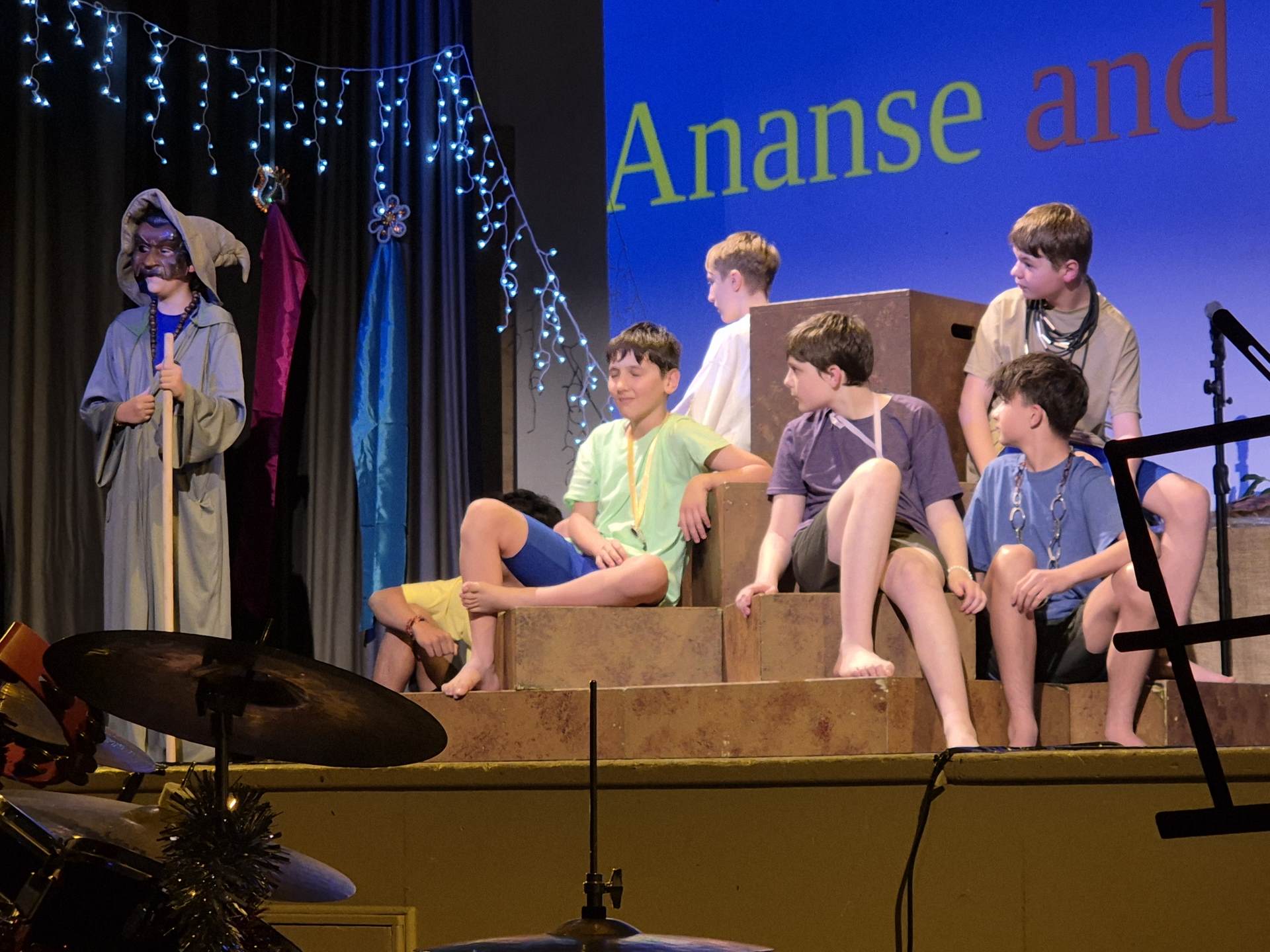 Ananse and the Sky-God is a fictional story of the trickster Ananse (usually depicted as a spider) who wants the Sky God's stories. We follow Ananse as he goes on quests to earn the stories to delight Earth. The Year 9 acting company are a small group of 11 students of which, some of them played three parts! The differences between parts were demonstrated through the use of masks – made by our expert Costume designer – Ms Hannat. There was humour whilst also presenting the underlying message that it is better to be smart than strong.
