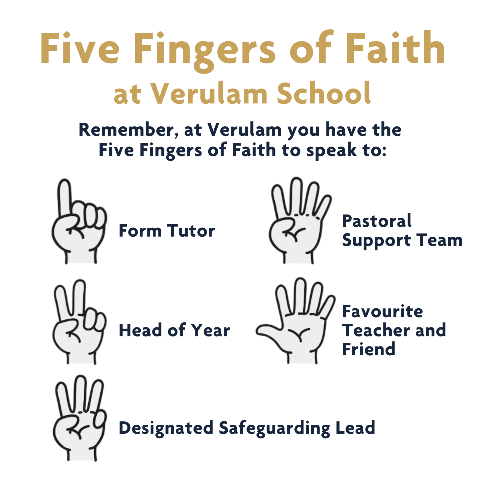 A central part of our support framework is the Five Fingers of Faith, which ensures every student knows they have five trusted adults to speak to: