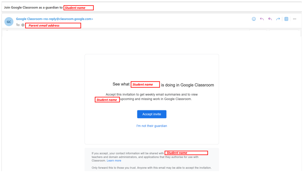 You would have already received an email invitation from Google Classroom this academic year. Please check your inbox for this email, including your junk folder. This email is sent from Google Classroom – no-reply@classroom.google.com. An example of what the email looks like is below.