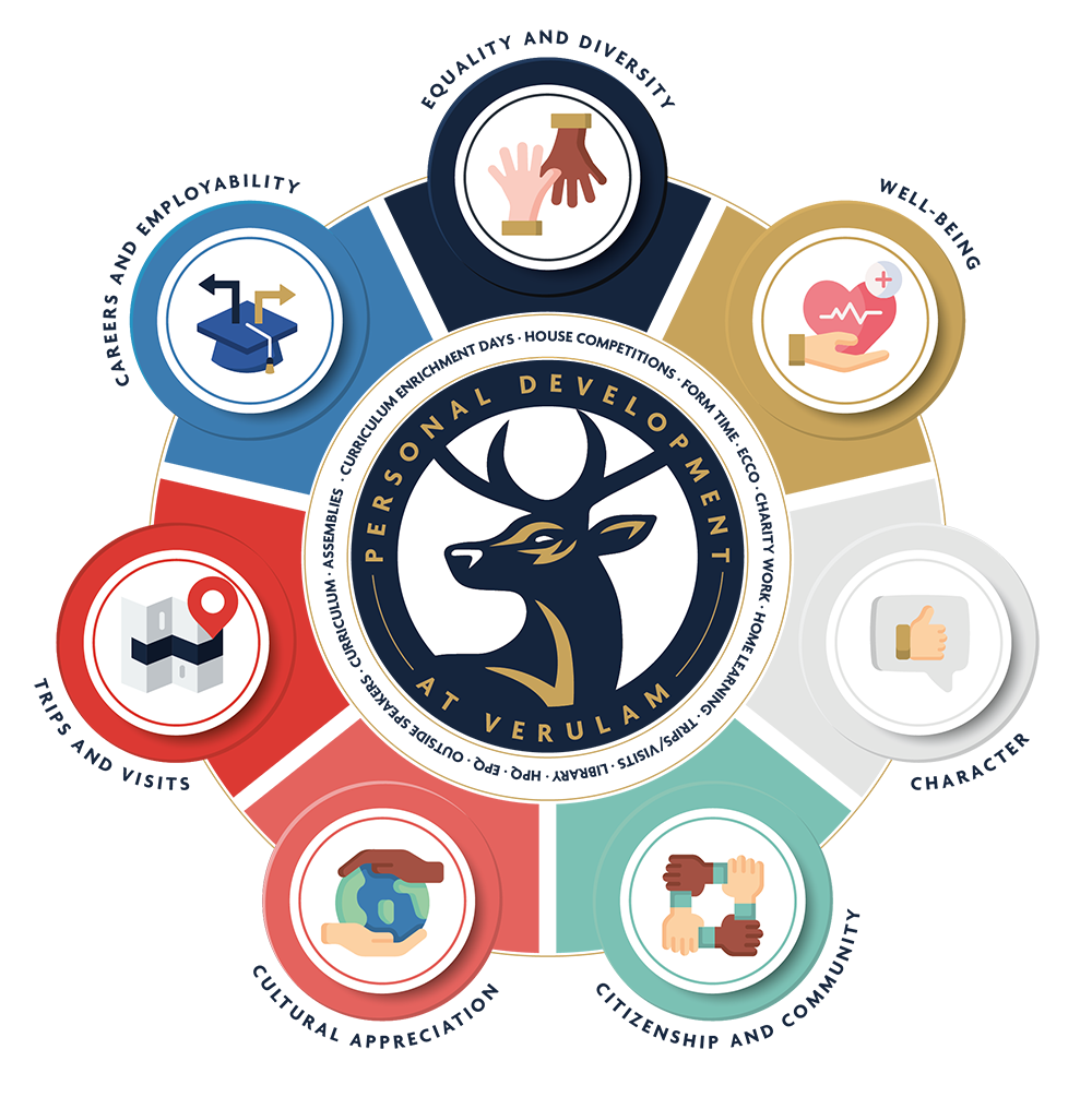 Personal Development is embedded in the wider curriculum of the school. It pervades the curriculum to the point where it is part of the fabric of all we do. At Verulam, the many ways we approach Personal Development can be categorised in the following seven key areas: