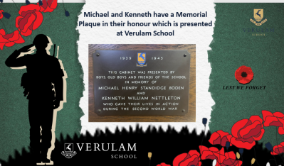 This year, we particularly remembered two Verulam Alumni, Michael Boden and Kenneth Nettleton. Both served during the Second World Way, Michael as Private in the 1st Battalion, Hertfordshire Regiment and Kenneth as a Sergeant in the RAF 550 Squadron. Both sadly lost their lives aged only 20, Michael on service in Italy on the 16 October 1944 and Kenneth on the 14th October 1944 in Germany.