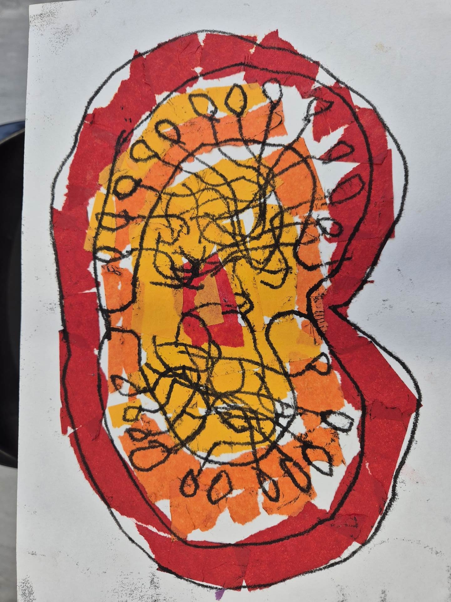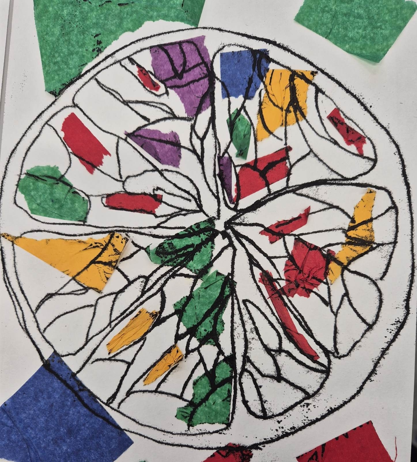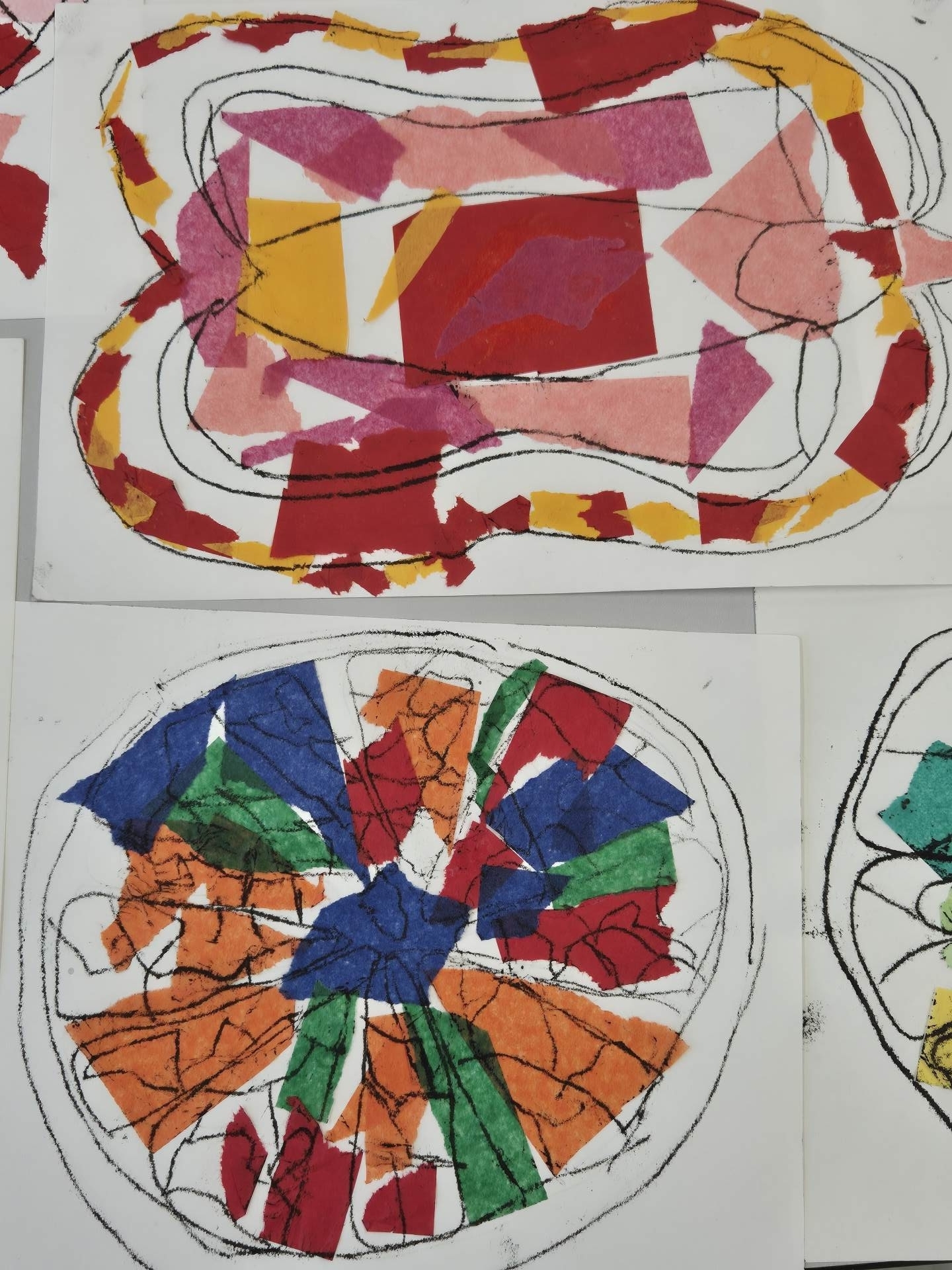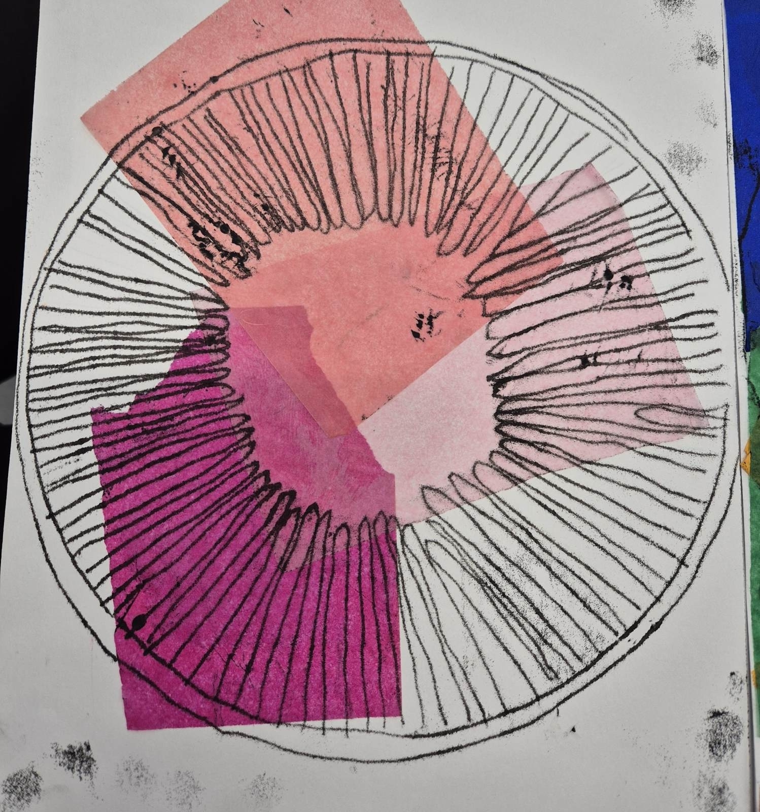 The students in year eight began their chine colle outcomes by collaging a colourful background with tissue paper before diving into the mono-printing process. This technique had them rolling out ink onto a flat surface, placing their collages face down over top and drawing their design on the back to leave an inky impression on top of their colourful backgrounds. The boys were very invested in this process and were dedicated to getting the best outcome as they only had one chance to get the best outcome they could.