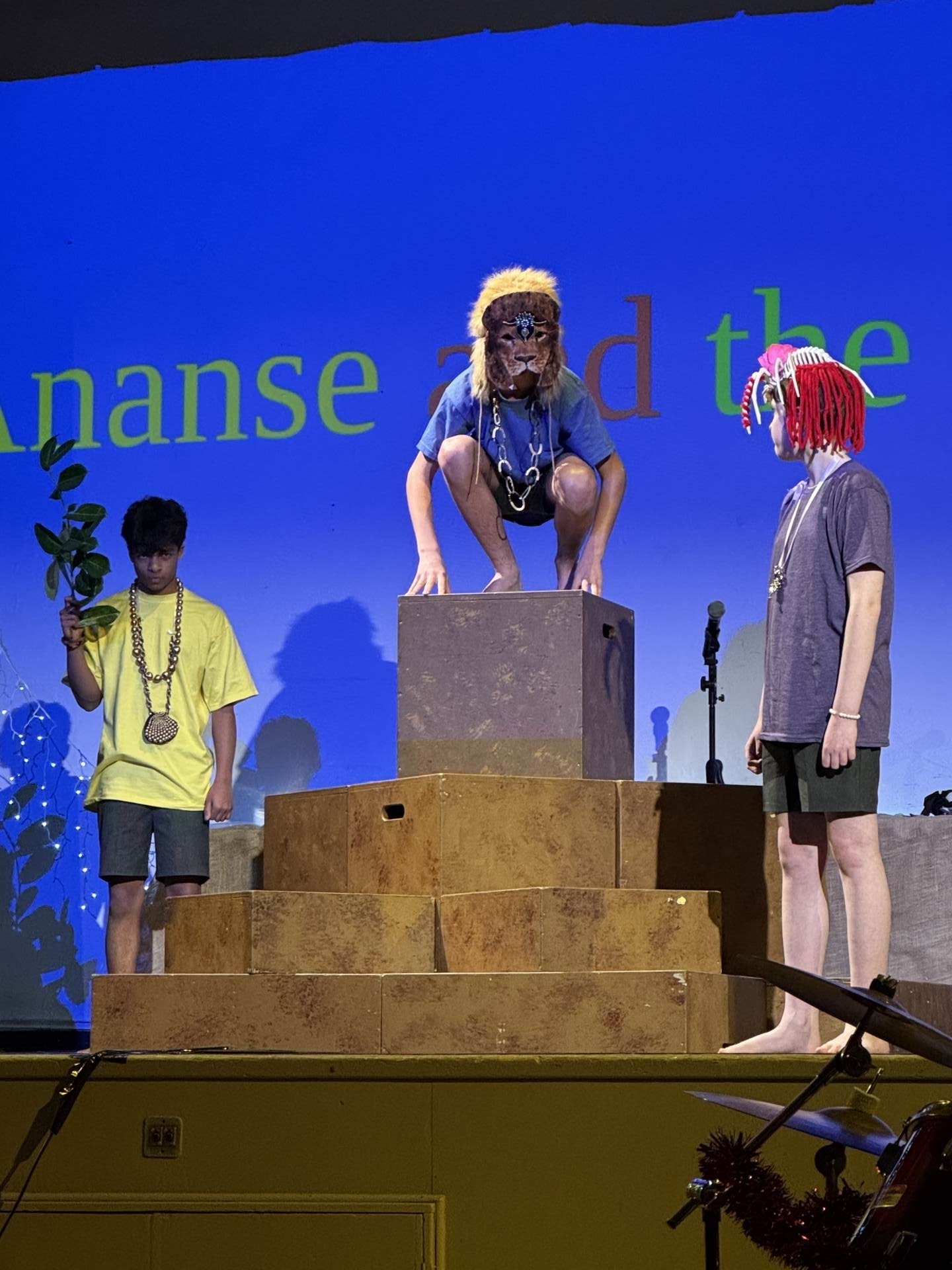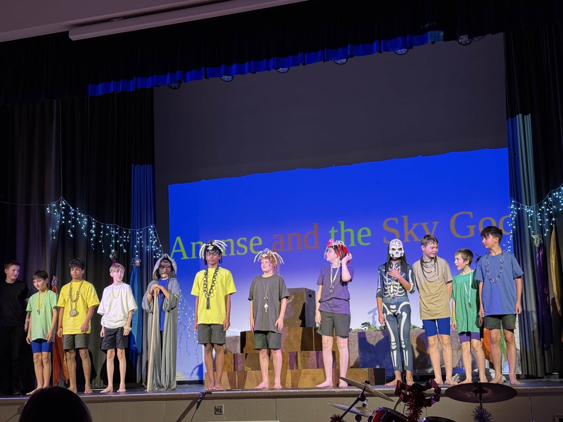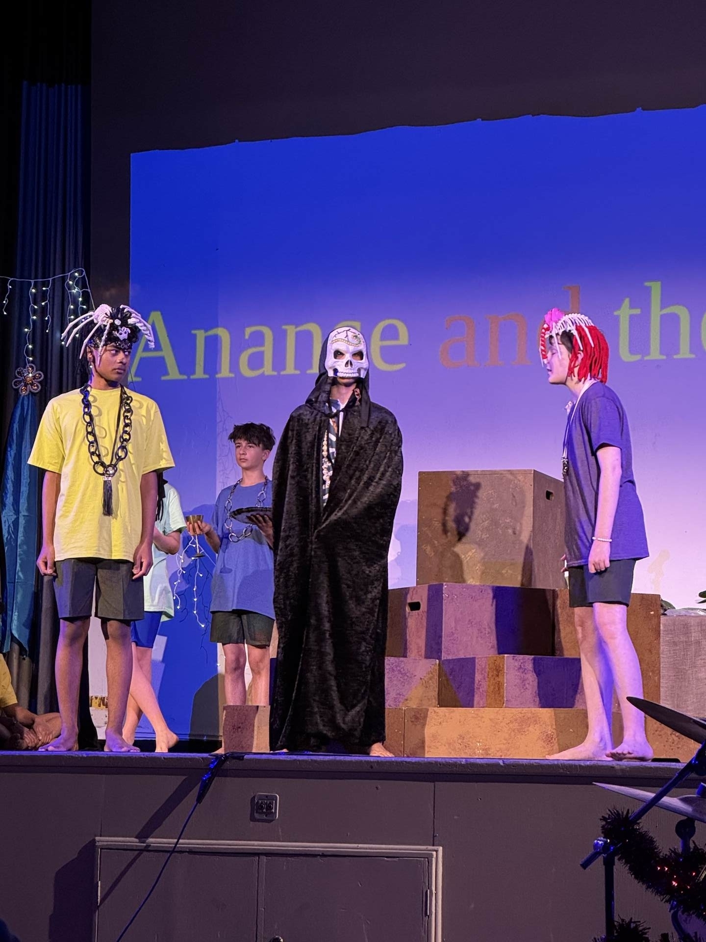Ananse and the Sky-God is a fictional story of the trickster Ananse (usually depicted as a spider) who wants the Sky God's stories. We follow Ananse as he goes on quests to earn the stories to delight Earth. The Year 9 acting company are a small group of 11 students of which, some of them played three parts! The differences between parts were demonstrated through the use of masks – made by our expert Costume designer – Ms Hannat. There was humour whilst also presenting the underlying message that it is better to be smart than strong.