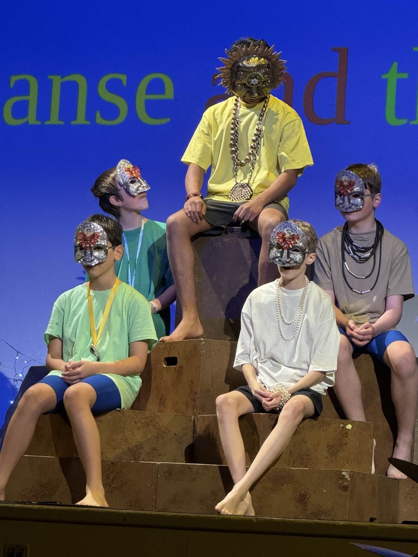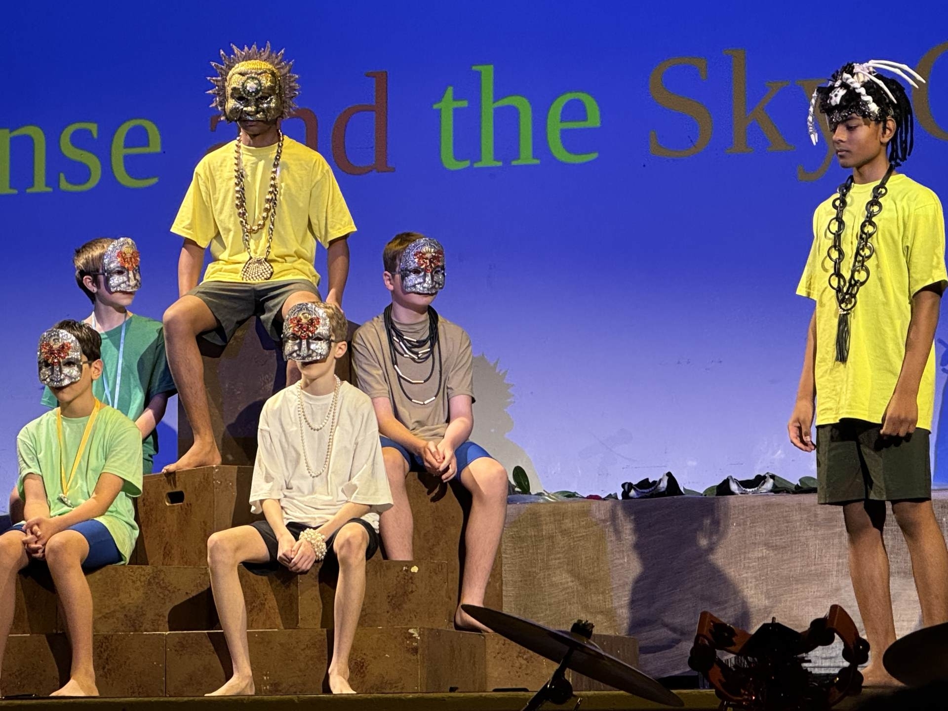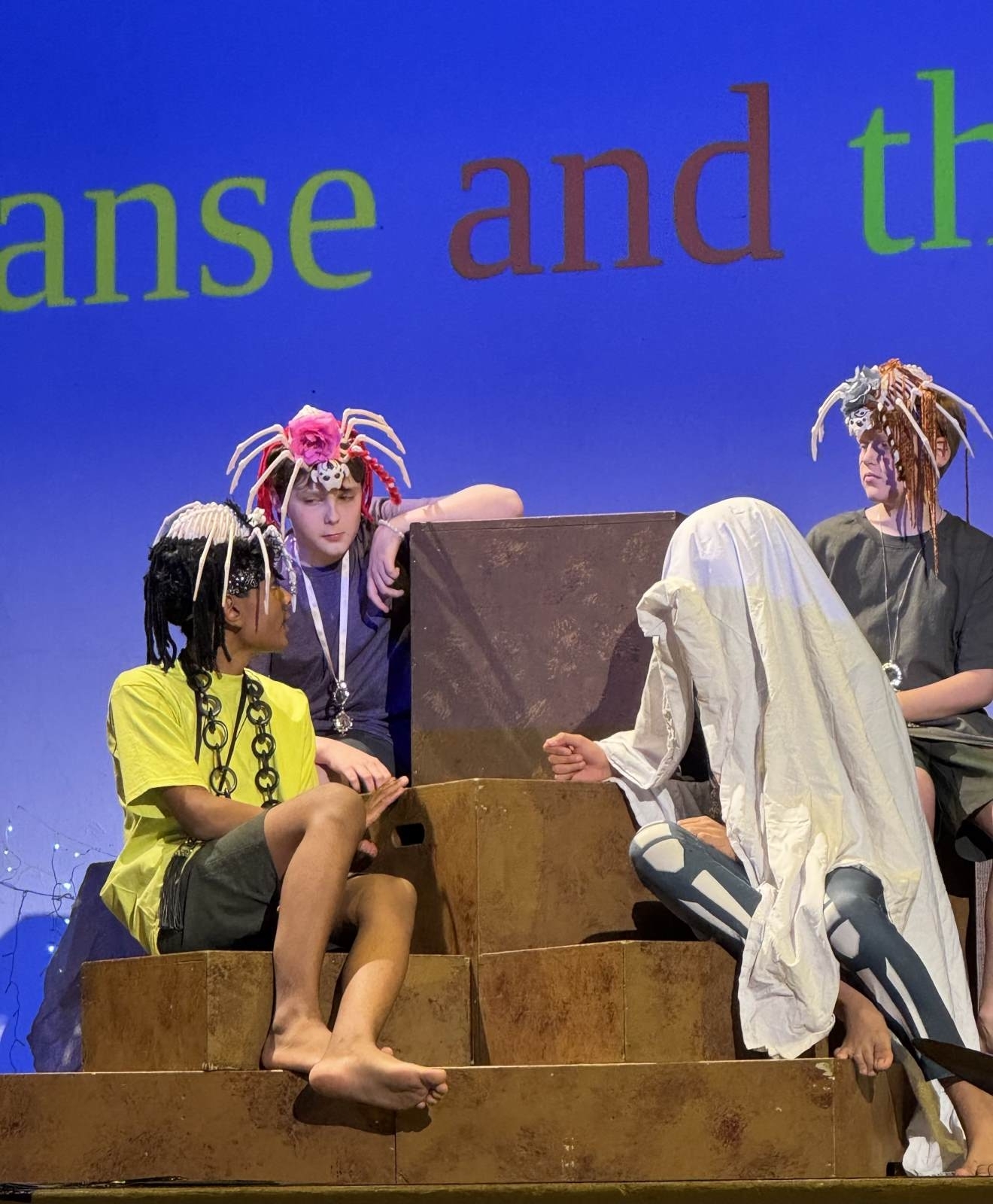 Ananse and the Sky-God is a fictional story of the trickster Ananse (usually depicted as a spider) who wants the Sky God's stories. We follow Ananse as he goes on quests to earn the stories to delight Earth. The Year 9 acting company are a small group of 11 students of which, some of them played three parts! The differences between parts were demonstrated through the use of masks – made by our expert Costume designer – Ms Hannat. There was humour whilst also presenting the underlying message that it is better to be smart than strong.